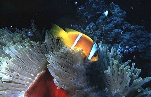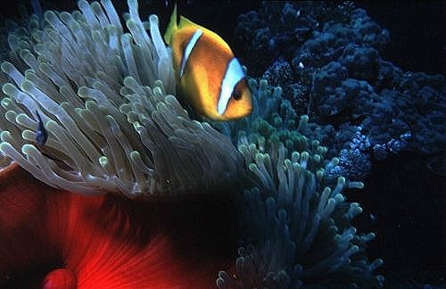 eine rote Anemone mit Anemonen- bzw. Clownfisch