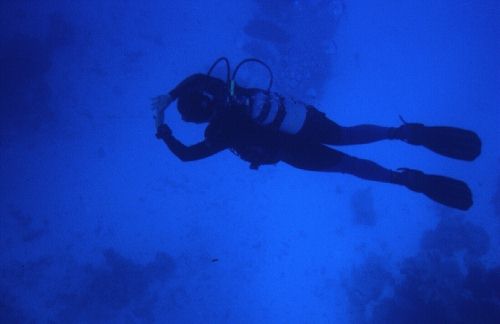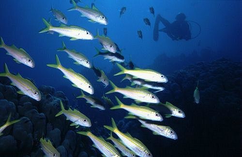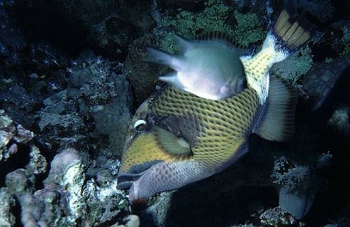 ein großer Drückerfisch und ein neugieriger Damsel-Fisch (dt. Name??)