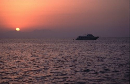 nur zum Sonnenuntergang war die nahe Küste zu erkennen