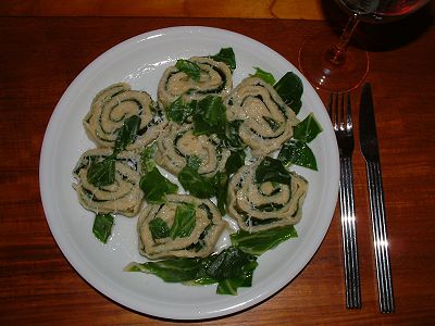 400 gr. Mehl, 4 Eier, 1 großer Bund Mangold, 1 frischer Bund Majoran (getrockneter geht auch!), 125 gr. Butter, Pfeffer, Salz, Parmesan