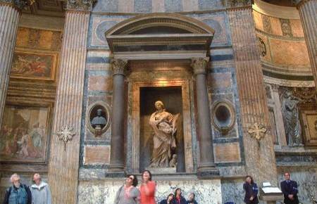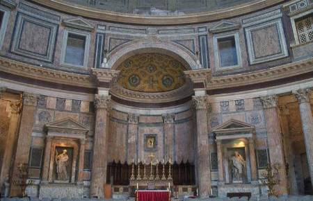 Dieses Lob bekam das Pantheon von keinem geringeren als Michelangelo. Der Prachtbau gilt als schönster und genialster Ausdruck römischer Architektur. Sein Ursprung geht zurück auf 27 v.Chr., als Agrippa einen Tempel für alle Götter schaffen wollte. Zwischen 120 und 125 n.Chr. wurde der Tempel unter Kaiser Hadrian völlig umgestaltet; 609 wurde er zur Kirche von "Sankt Marien und allen Märtyrern" geweiht. |