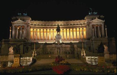 Wie eine überdimensionale Hochzeitstorte oder eher wie eine Mega-Schreibmaschine, so thront es mitten auf der belebten Piazza Venezia, das mit 12 m Höhe gigantischste Reiterdenkmal der Welt, das sich der italienische König 1885 bis 1911 errichten ließ. Nach dem 1. Weltkrieg wurde das Grabmal des Unbekannten Soldaten angefügt. Als letzte Zugabe kamen 1970 noch die beiden Ewigen Feuer hinzu. Das Monument krönen zwei Bronze-Wagen mit der Siegesgöttin, für die Römer das Beste am Denkmal. Die Siegesgöttin kann man nämlich von verschiedenen Stellen der Stadt sehen; so dient das protzige Monument wenigstens als Orientierung. |